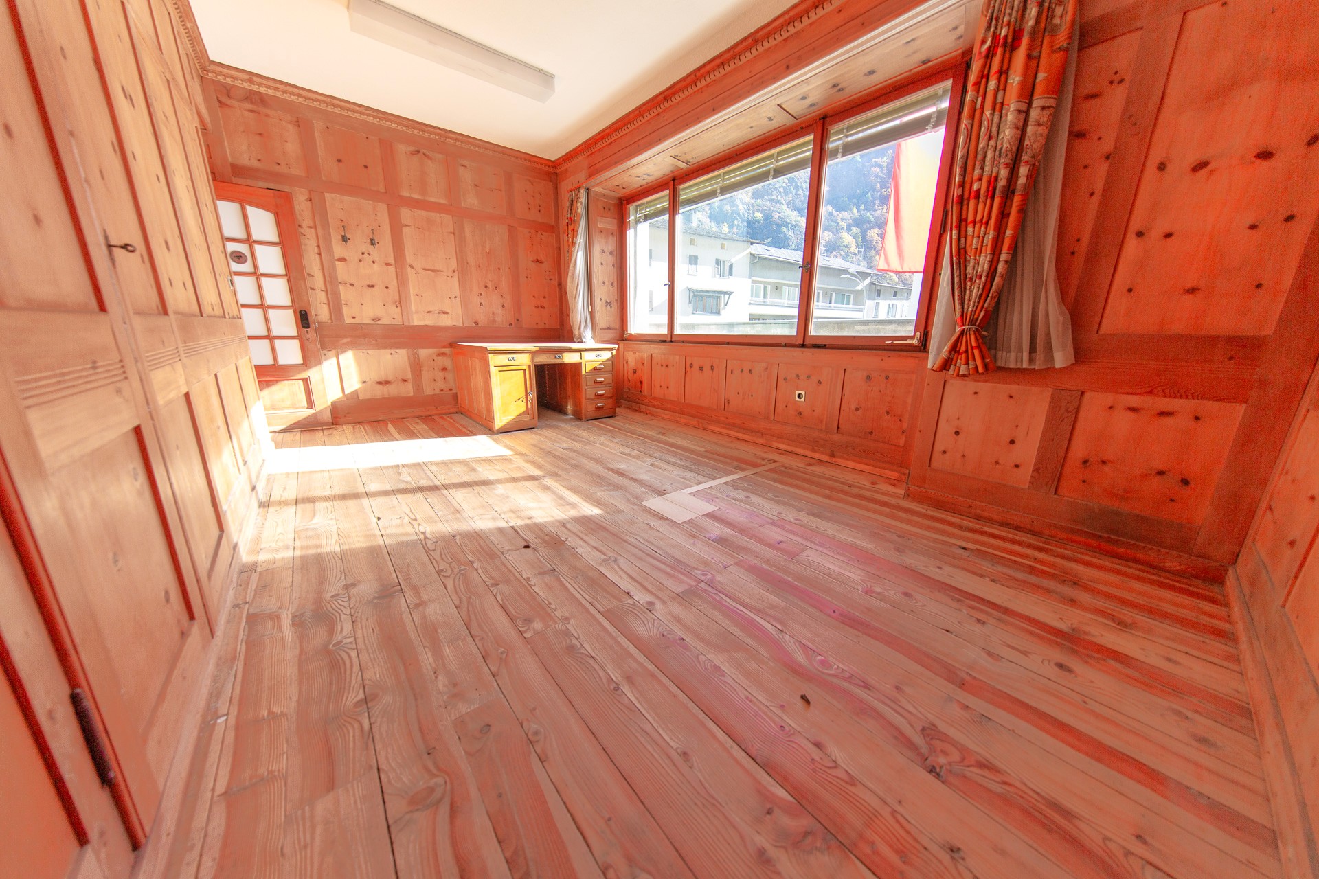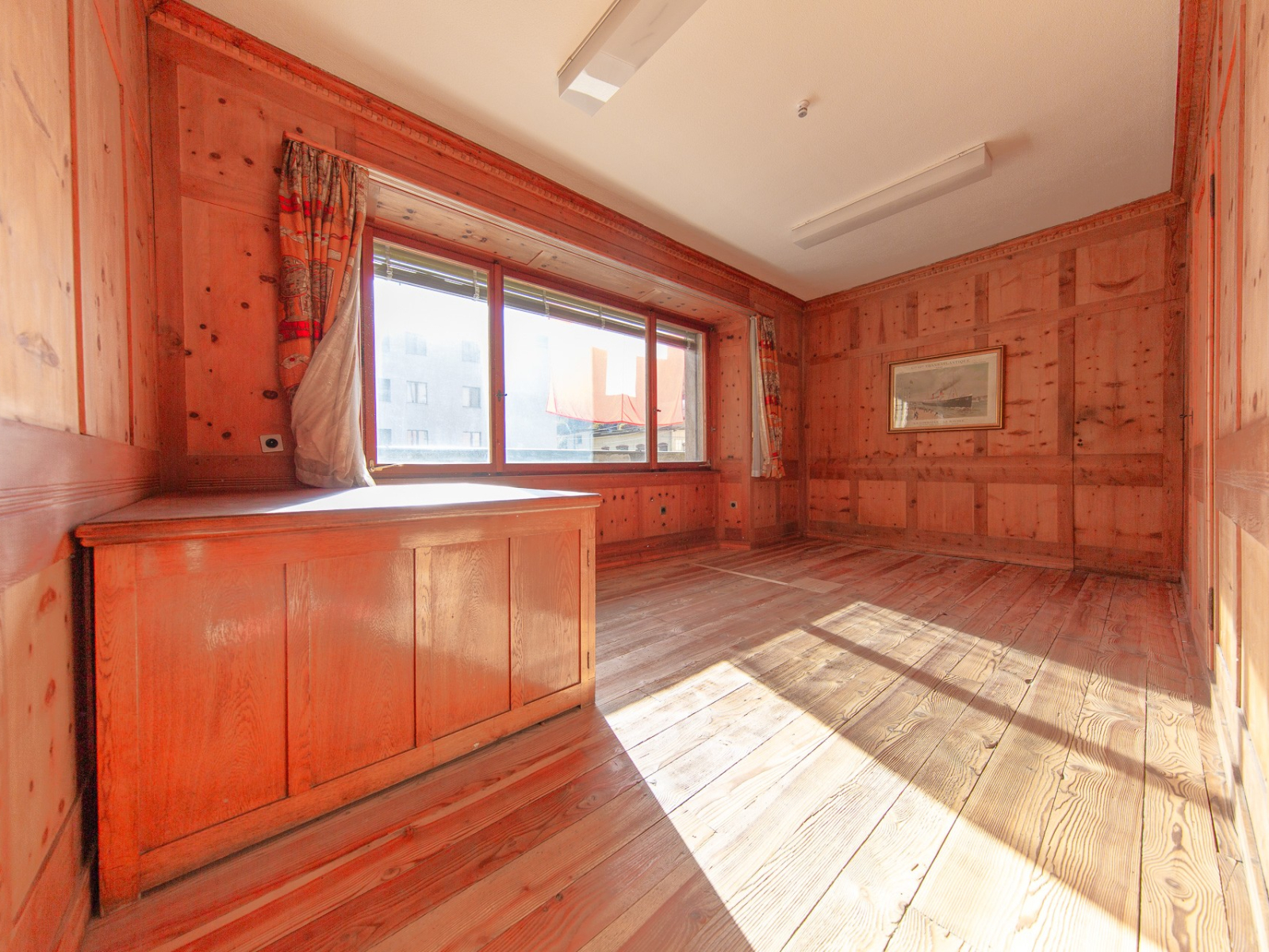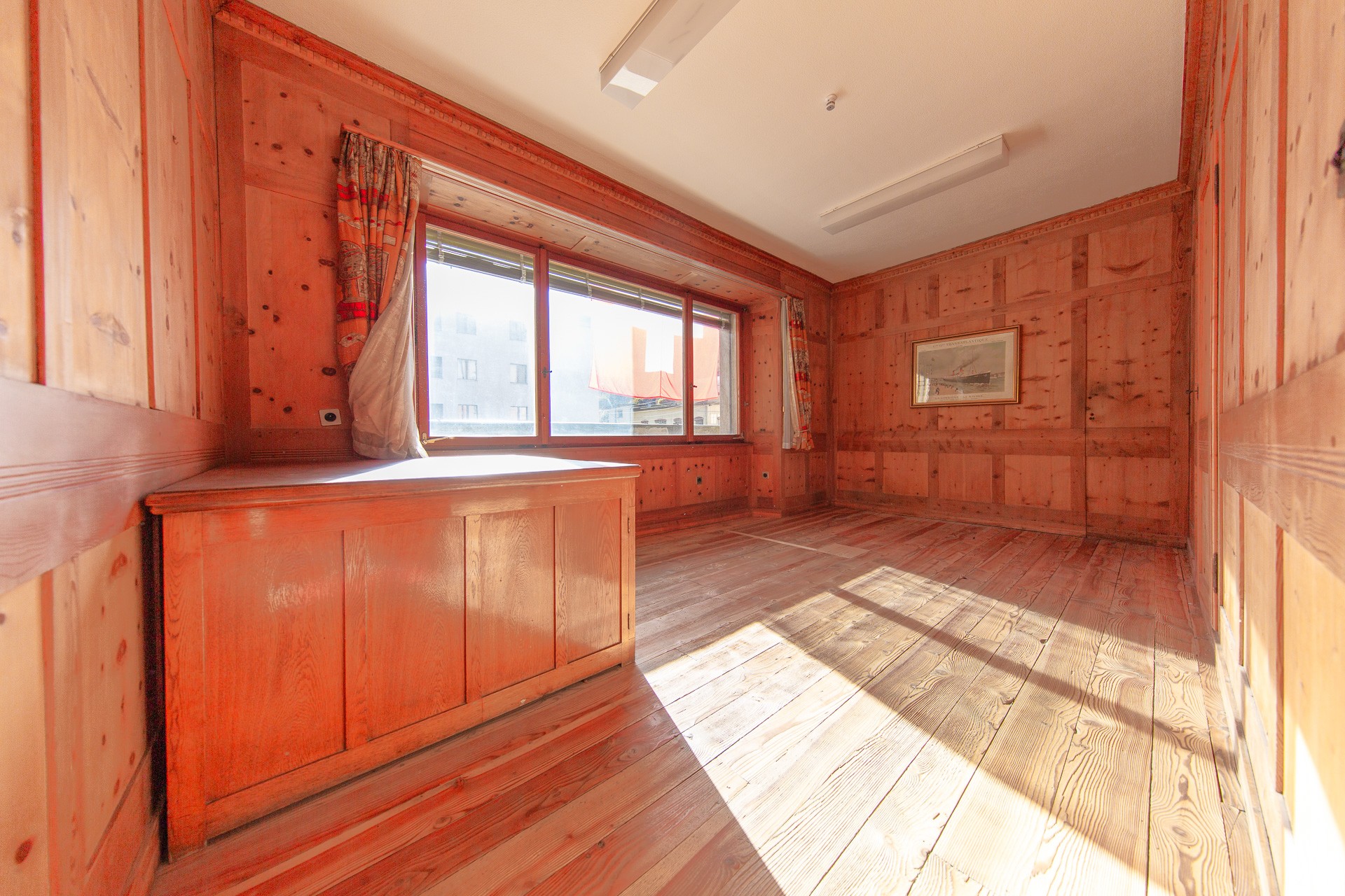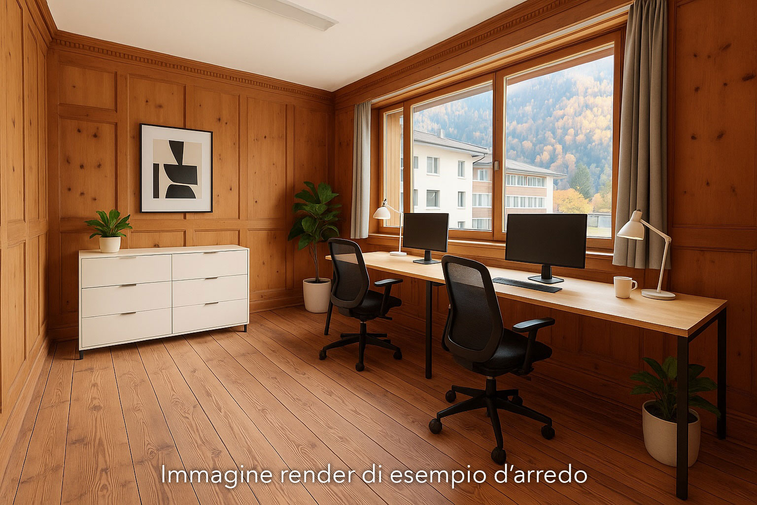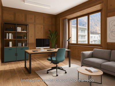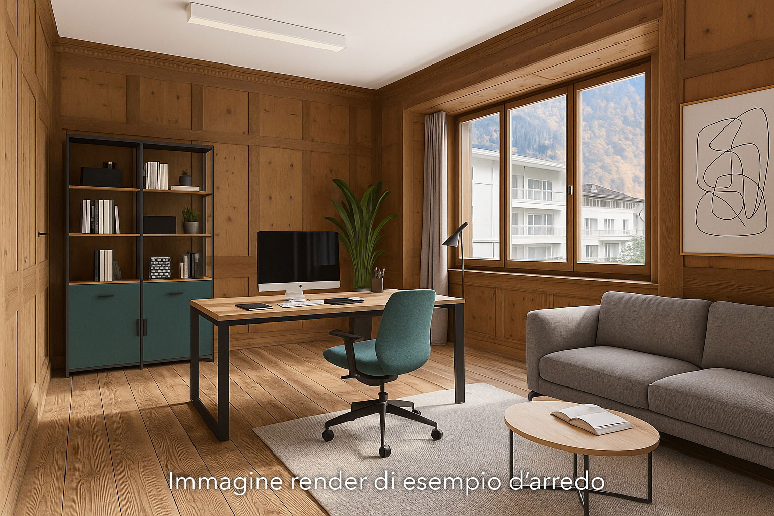 Ufficio al 1° piano, luminoso e accogliente con rivestimenti in legno massiccio e ampia finestra.